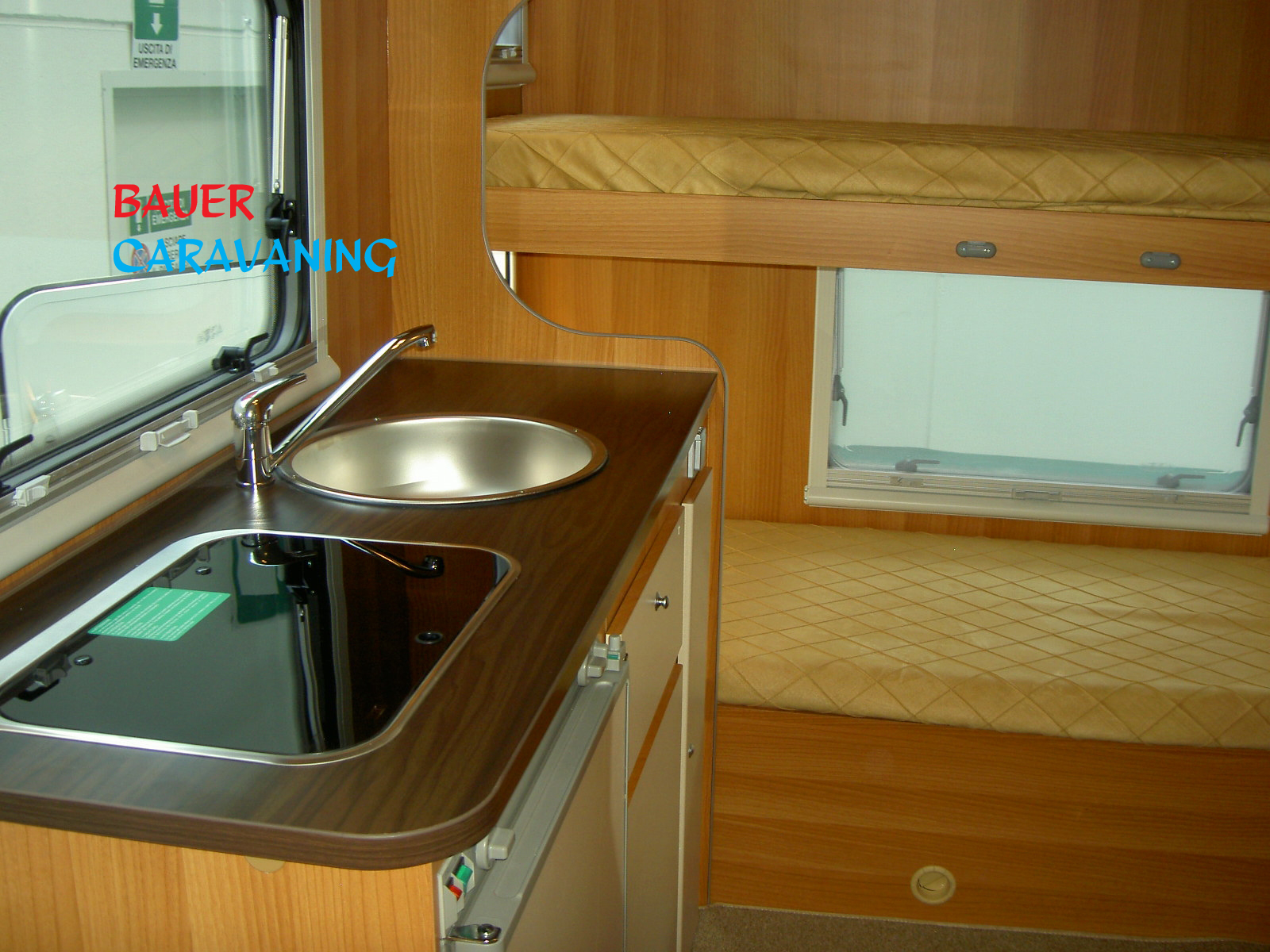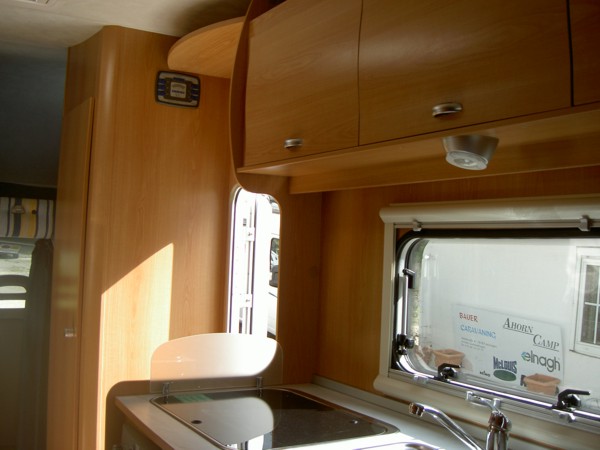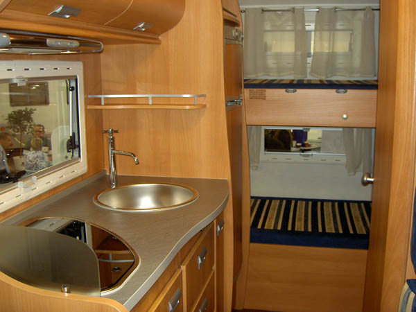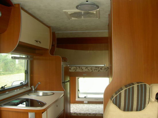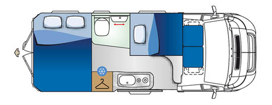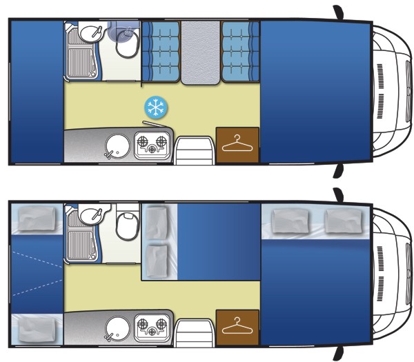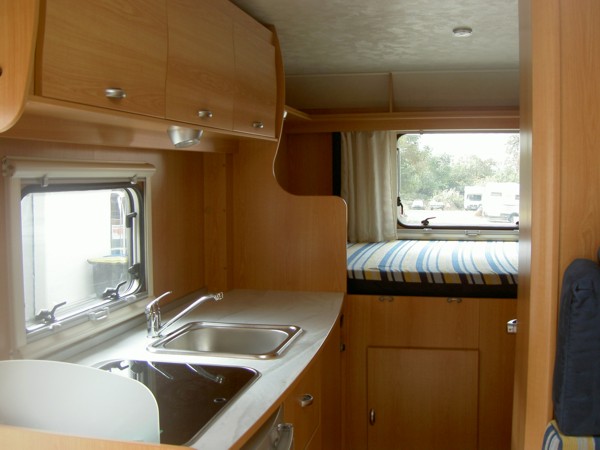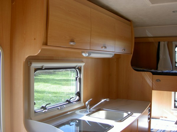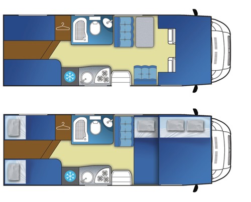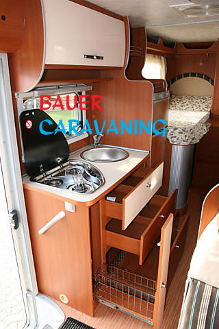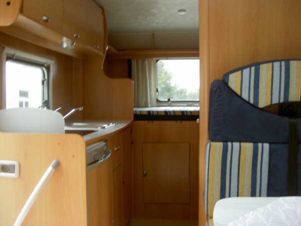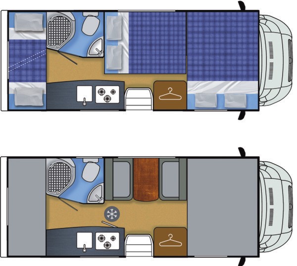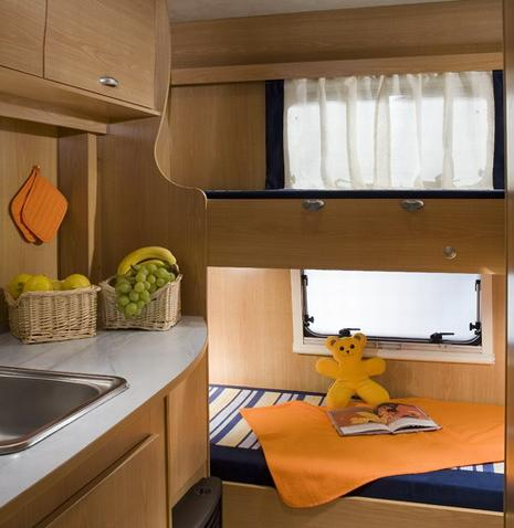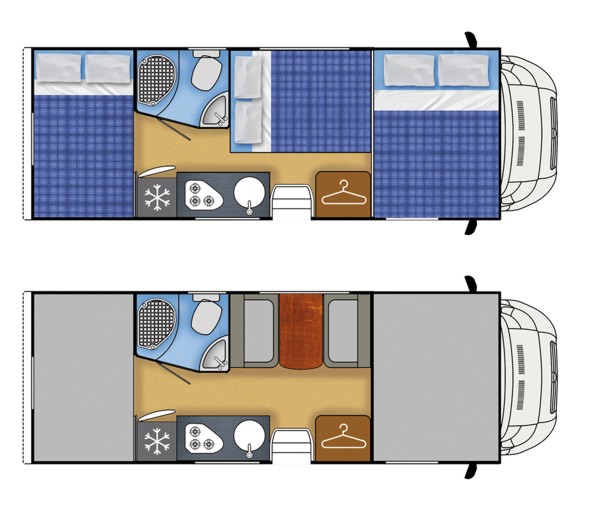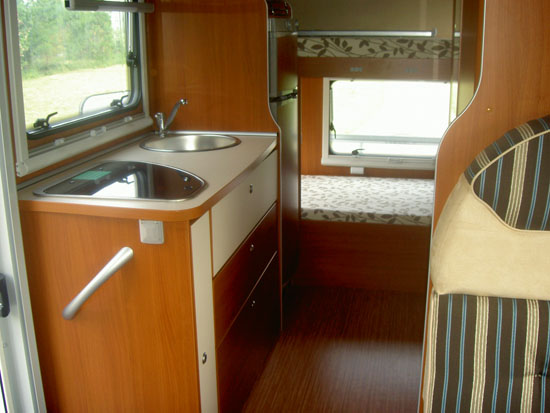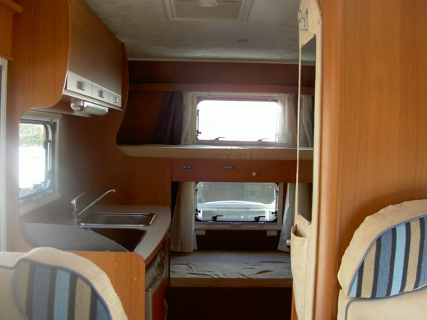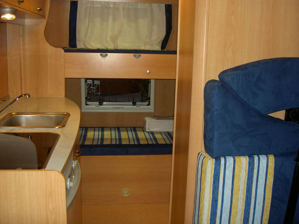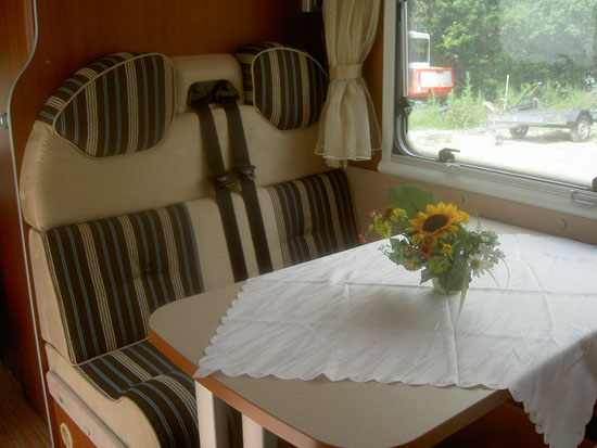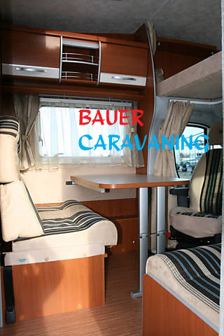 Sitzplätze, 4er Sitzgruppe, Etagenbetten hinten quer, Küche, Dusche, WC,