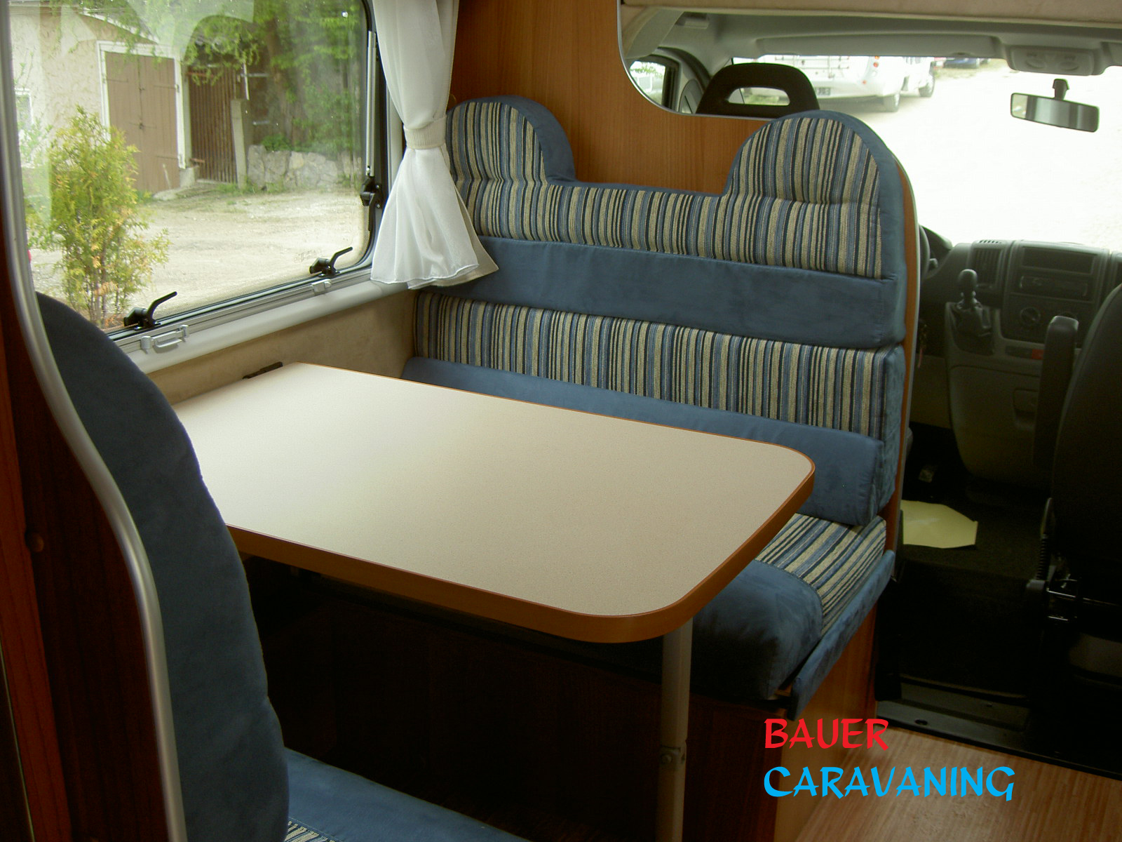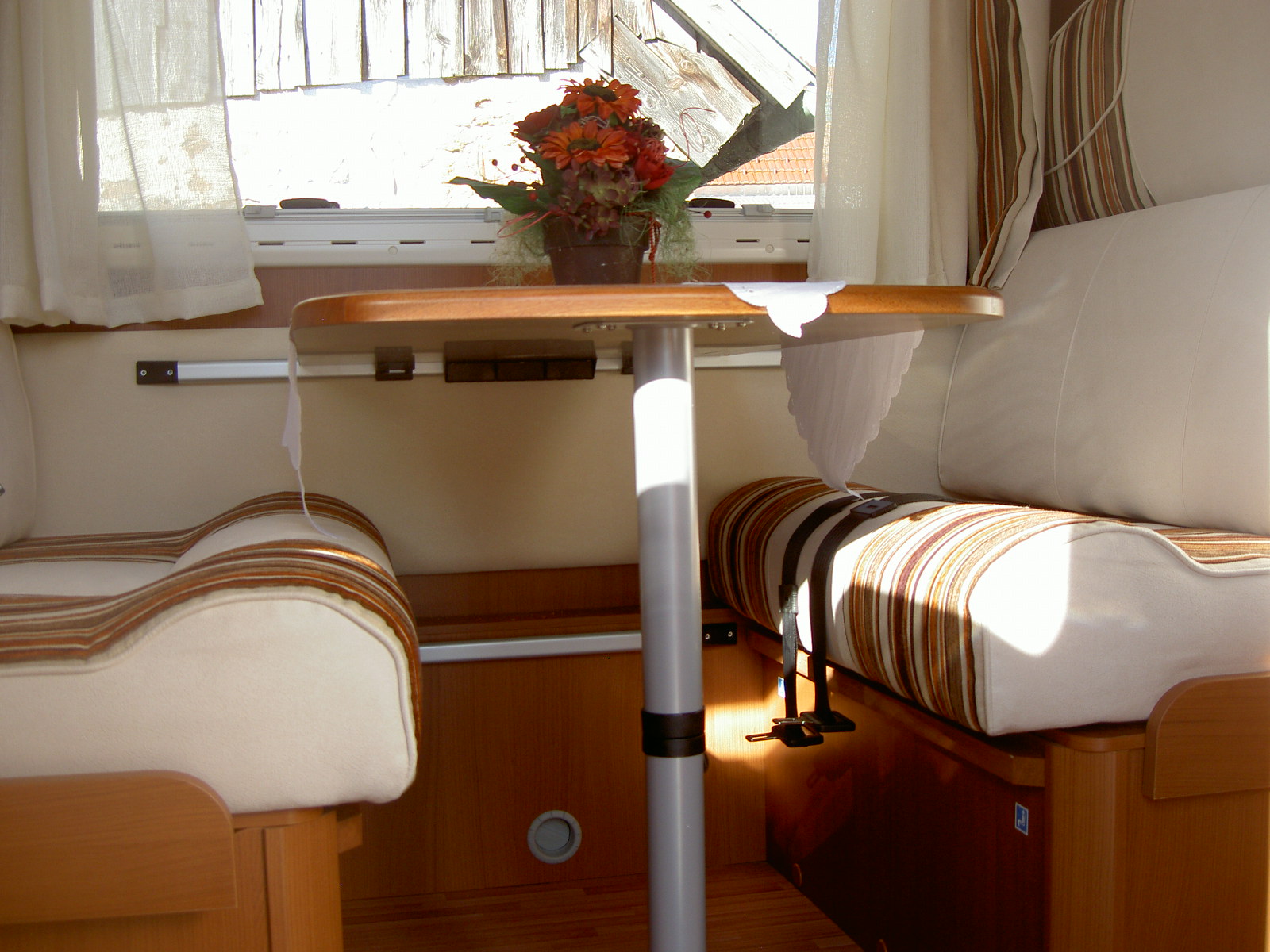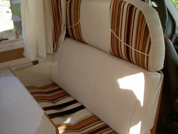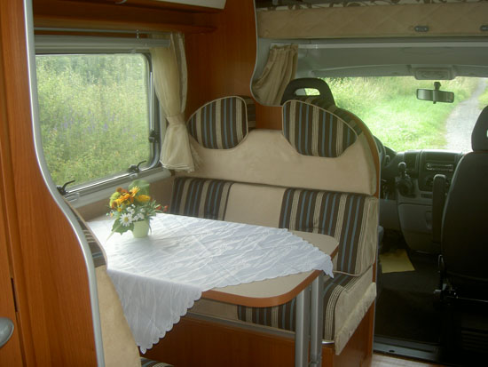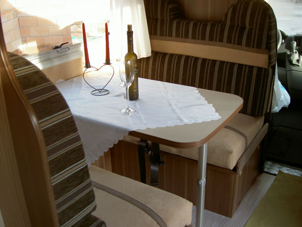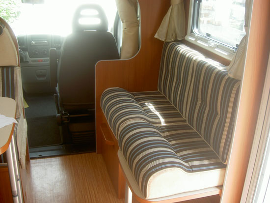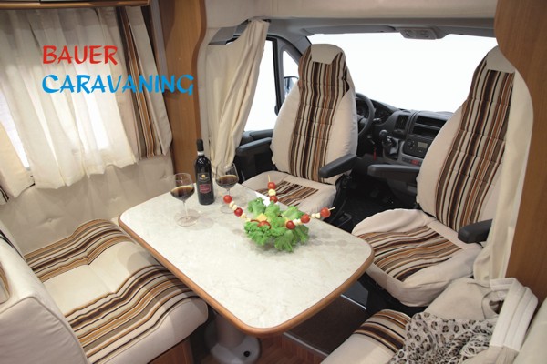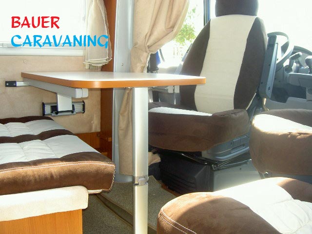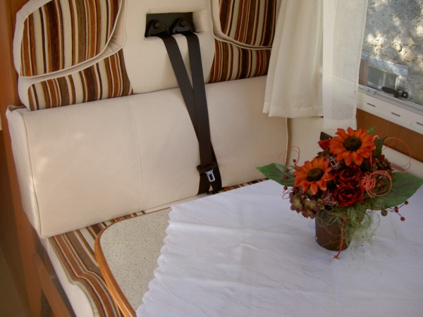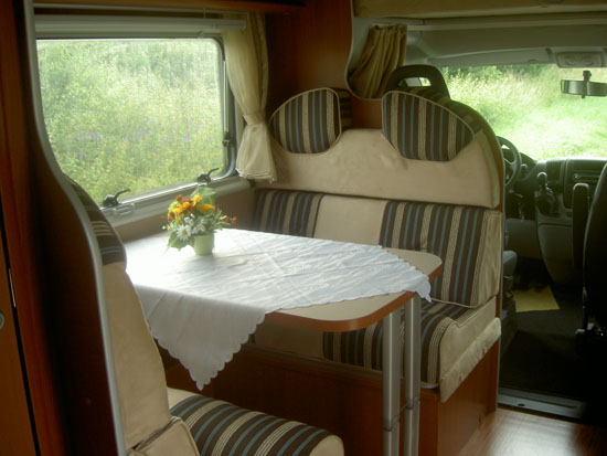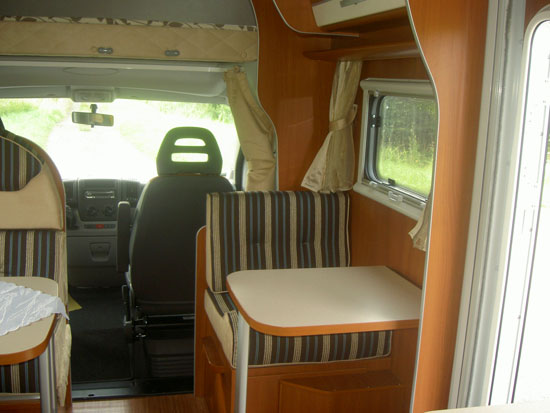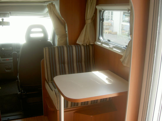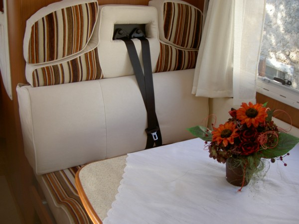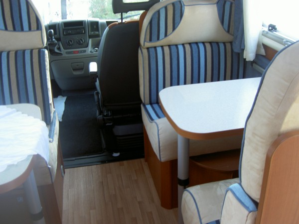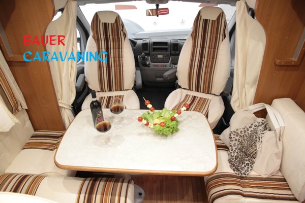 Halbdinette mit drehbaren Fahrerhaussitzen und Seitenbank, absenkbares