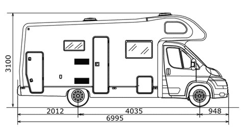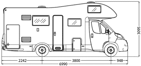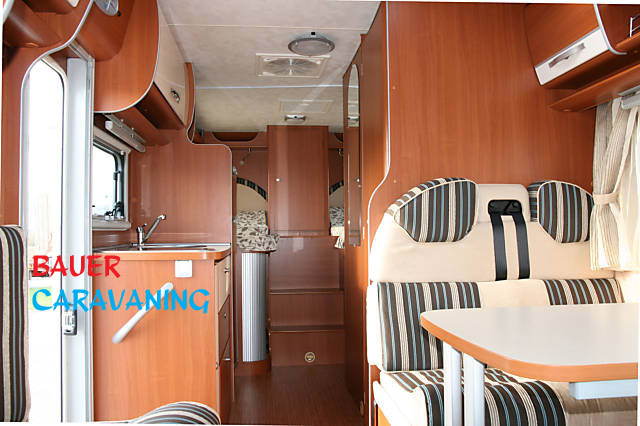 Doppelairbag, Tempomat, Klimaanlage, Markise, Radio CD, Fahrradträger, Metallic Lackierung, doppelte Armlehnen, Spiegelantenne, Fliegenschutztüre, Servolenkung, Standheizung, WC, Zentralverriegelung , Fernsehfach, Teilintegrierter mit großem Hubbett 1450 x 2100 mm, festes Heckbett mit darunter liegendem Stauraum mit Außenstauklappe, Nasszelle mit separater Dusche und fester Duschtür, Winkelküche, Halbdinette mit drehbaren Fahrerhaussitzen und Seitenbank, absenkbares Hubbett, Ausstattung: ASR, elektrische Fensterheber, elektrische Außenspiegel, Funkzentralverriegelung Fahrerhaus, Fahrer und Beifahrerairbag, Fahrerhausklimaanlage, Dachluke Midi-Heki, Metallic Lackierung Fahrerhaus, Kühl / Gefrierkombination 150l, Fliegenschutztür, komplette GFK Kabine (Hagelresistent), Zulässiges Gesamtgewicht 3500kg, Zuladung ca. 570 kg. Länge: 6.865 mm, Breite 2.350 mm, Höhe: 2.850 mm